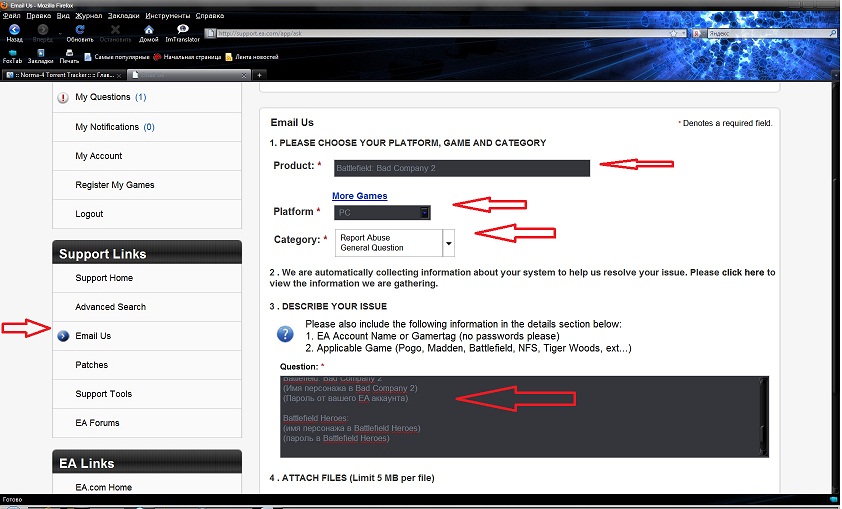 страница отправки письма в службу поддержки Electronic Arts и пишем