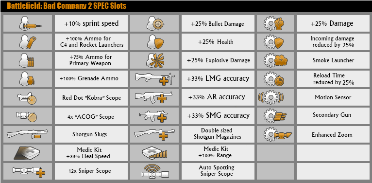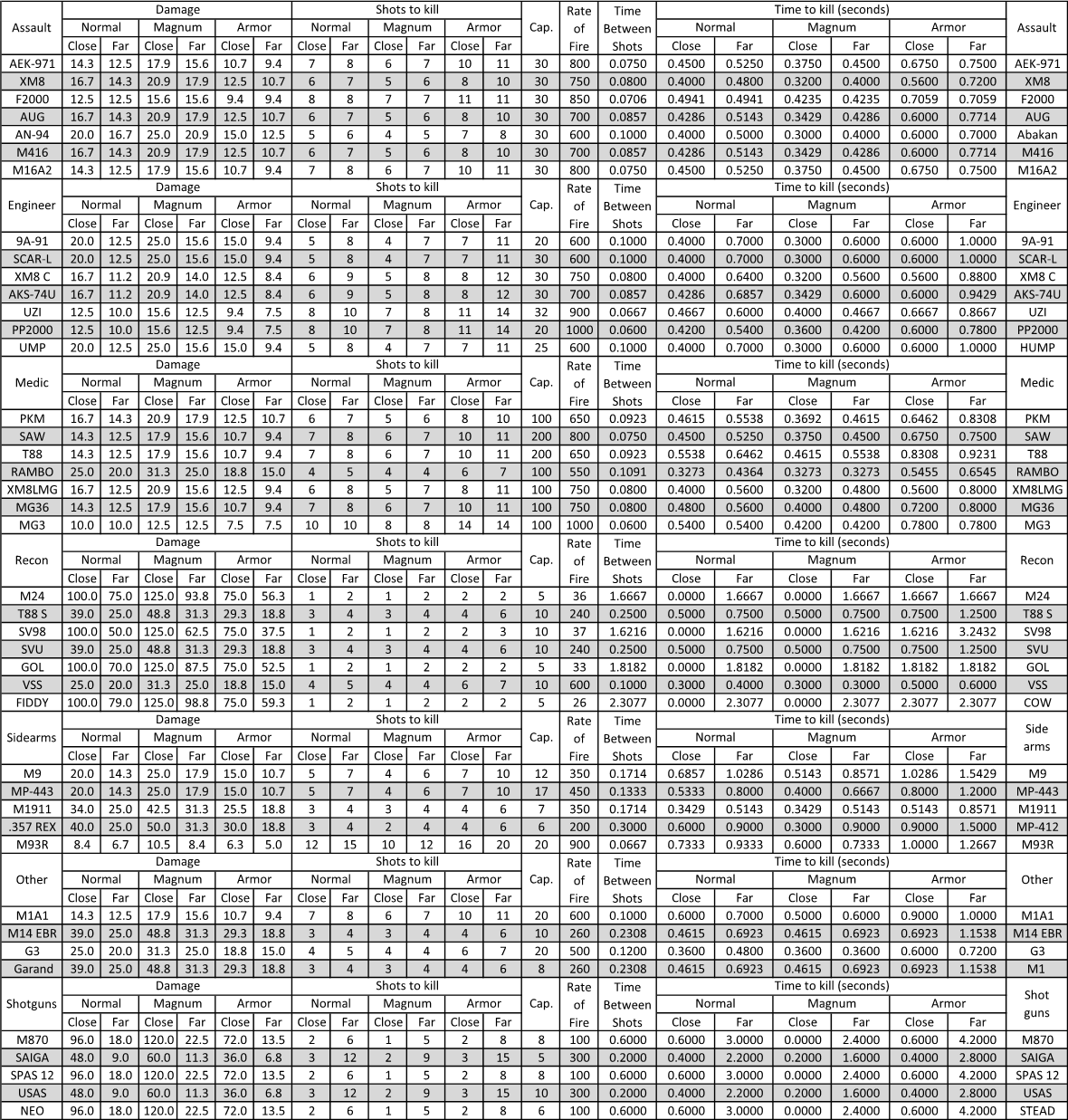 Оружие наносит максимальный урон пока не достигает точки начала спада, затем падает линейно до точки конца спада, дальше этой точки весь урон будет минимальным.Каждый боец имеет по умолчанию имеет 100hp (125hp при использовании перка на доп. броню)